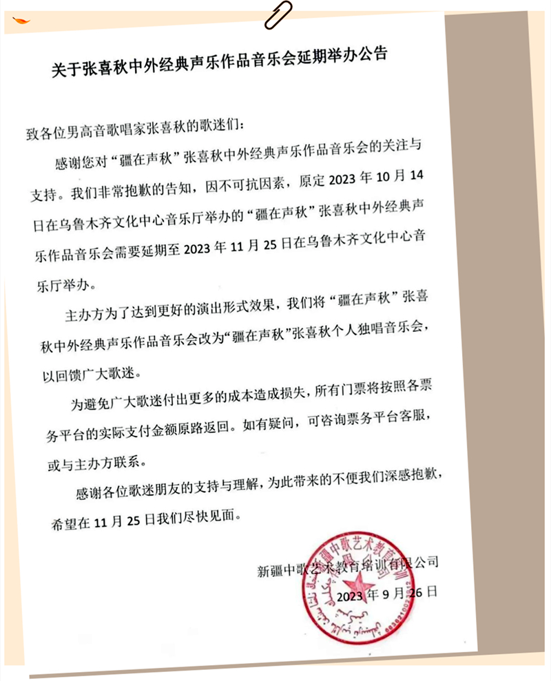 原定2023年10月14日在乌鲁木齐文化中心·音乐厅举办的“疆在声秋”张喜秋中外经典声乐作品音乐会将延期至2023年11月25日。