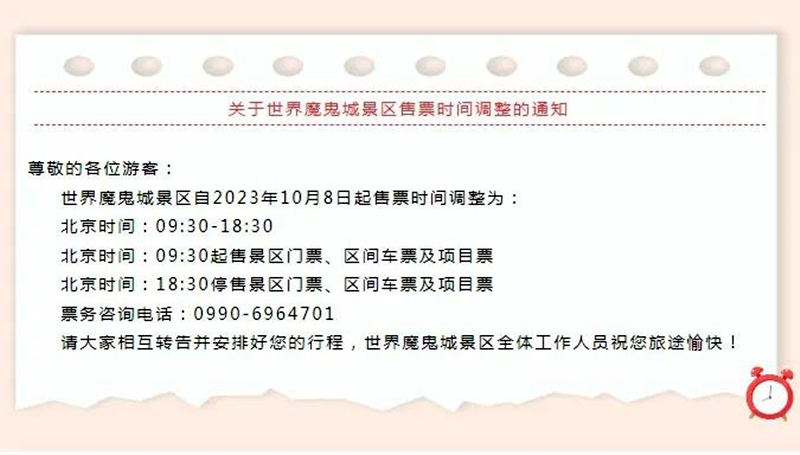 克拉玛依市世界魔鬼城景区自2023年10月8日起售票时间调整为:9:30-18:30(9:30起售景区门票、区间车票及项目票,18:30停售景区门票、区间车票及项目票)。