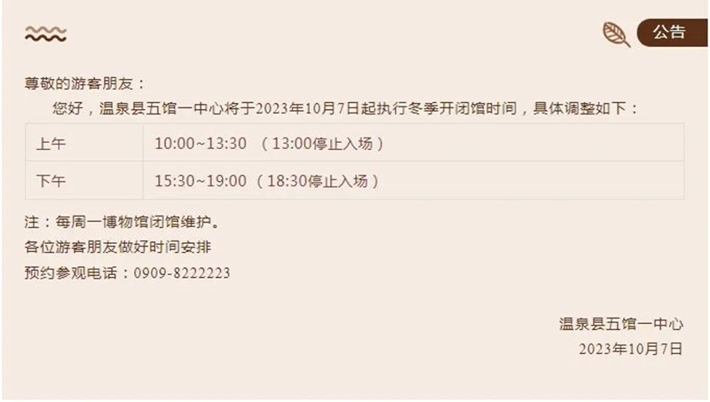 注:温泉县五馆一中心将于2023年10月8日(星期日)进行基础建设设施维护检修,暂定闭馆一天。