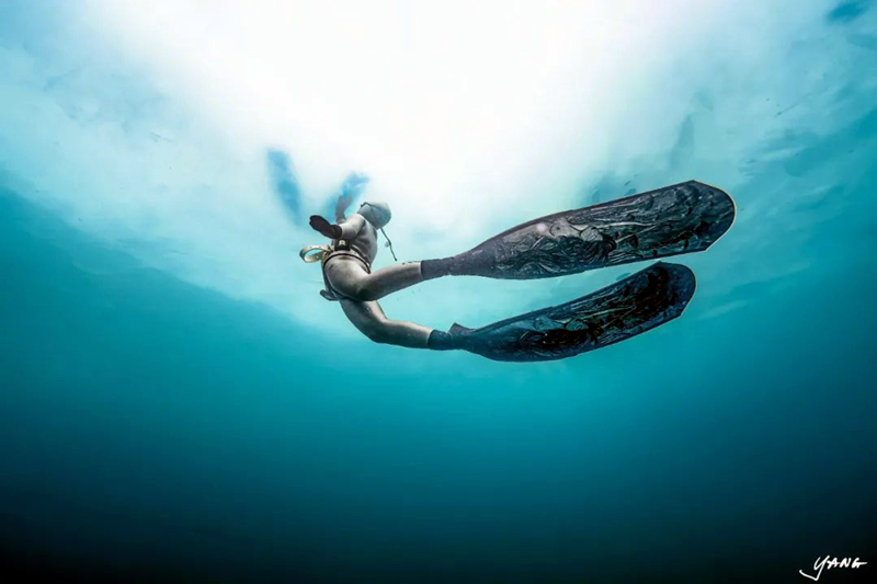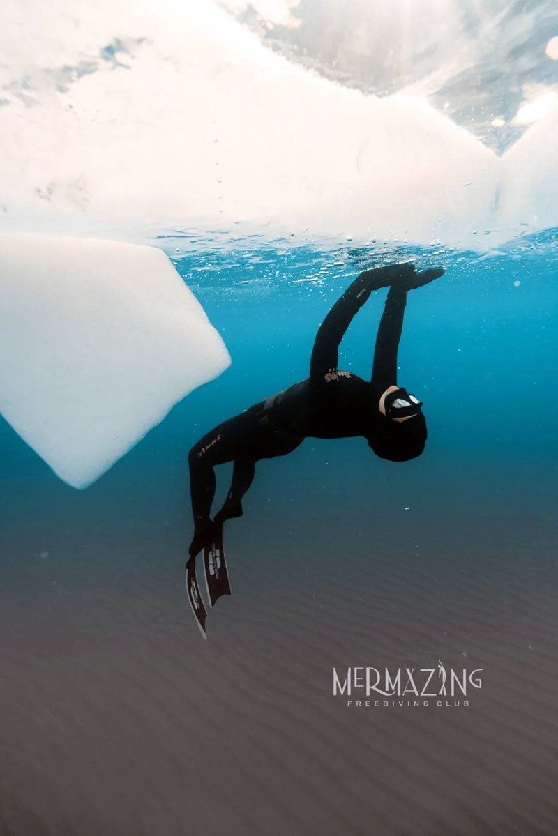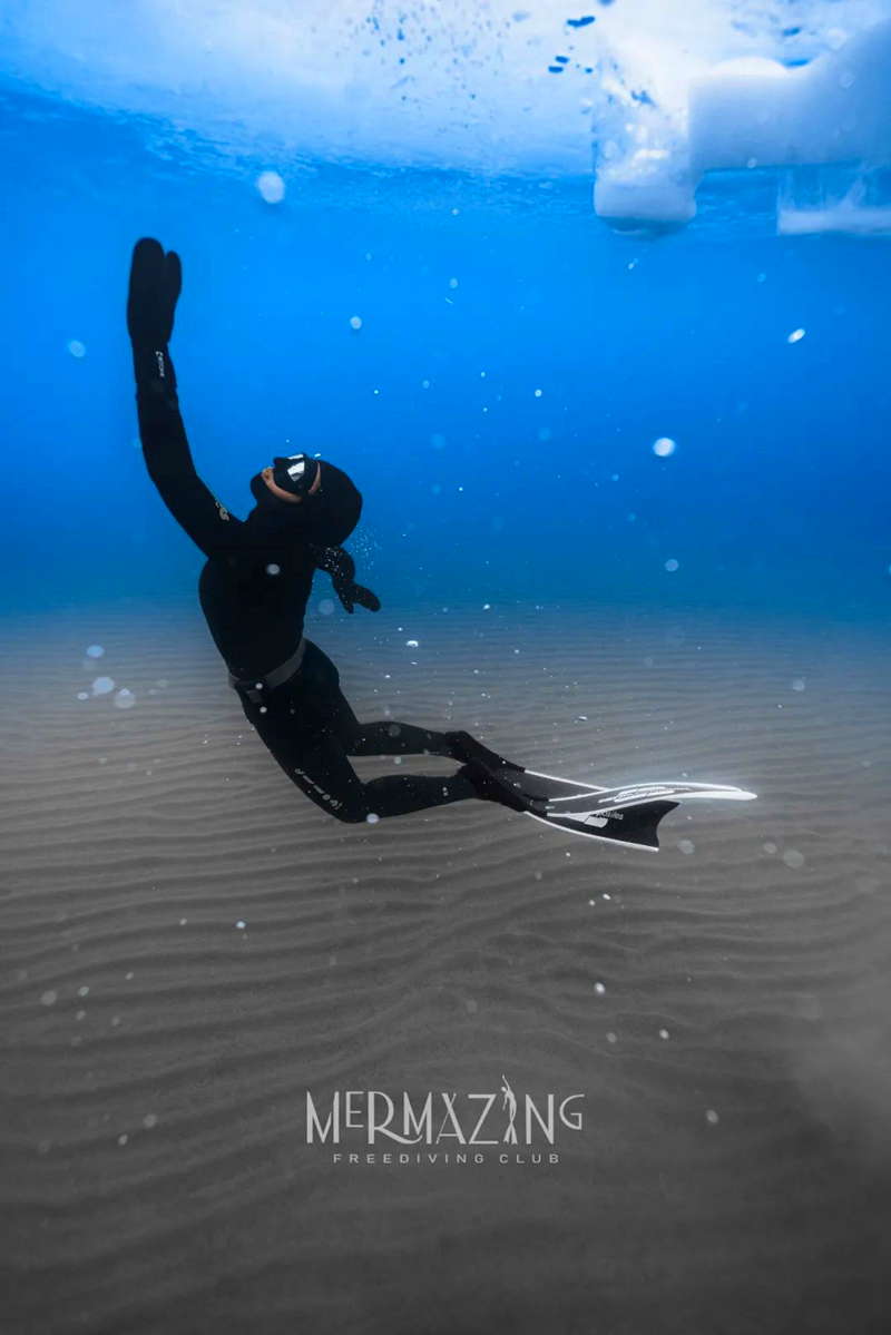 冰潜装备:建议准备7毫米及以上的自由潜冰潜湿衣,手套和袜子建议9毫米更加保暖,冰潜的时候最先感受到寒冷的就是脸手脚。冰潜袜子较厚所以需要配大两码的脚蹼。无需担心穿了湿衣配重不够,潜点会保证管够。