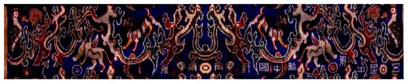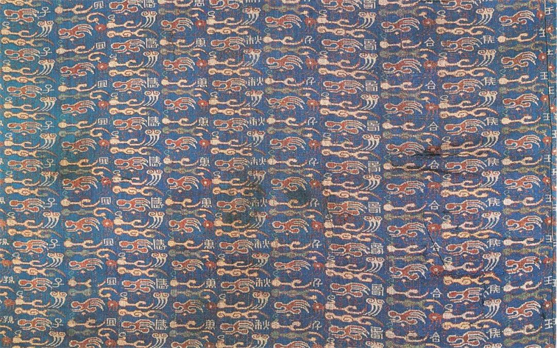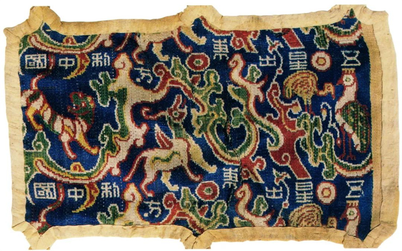“五星出东方利中国”锦护臂出自精绝王子墓中,被誉为20世纪中国考古最伟大的发现之一。此锦在缭绕的云气骨架中,穿插中国传统天文星占的占辞——“五星出东方利中国”小篆文字、圆圈纹表现的“五星”图案,以及凤凰、鸾鸟、麒麟、白虎等祥禽瑞兽。织造采用白、青、 黑、赤、黄五色经丝,花纹流畅自如,极为华丽,代表了汉代织锦技术的最高水平。五色、“五星”,体现汉代阴阳五行思想。以此铭文锦为护臂,反映出精绝王族对中华文化的推崇与认同。