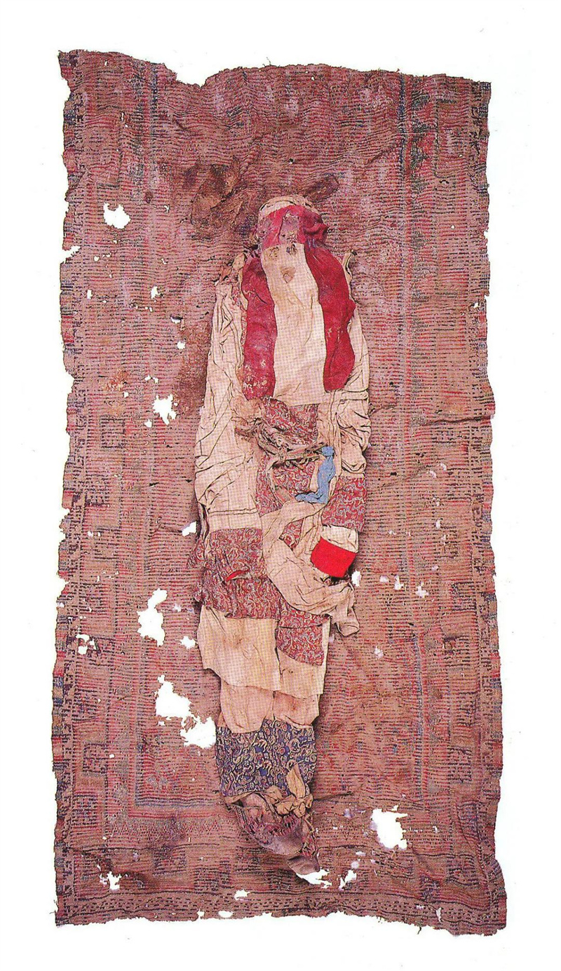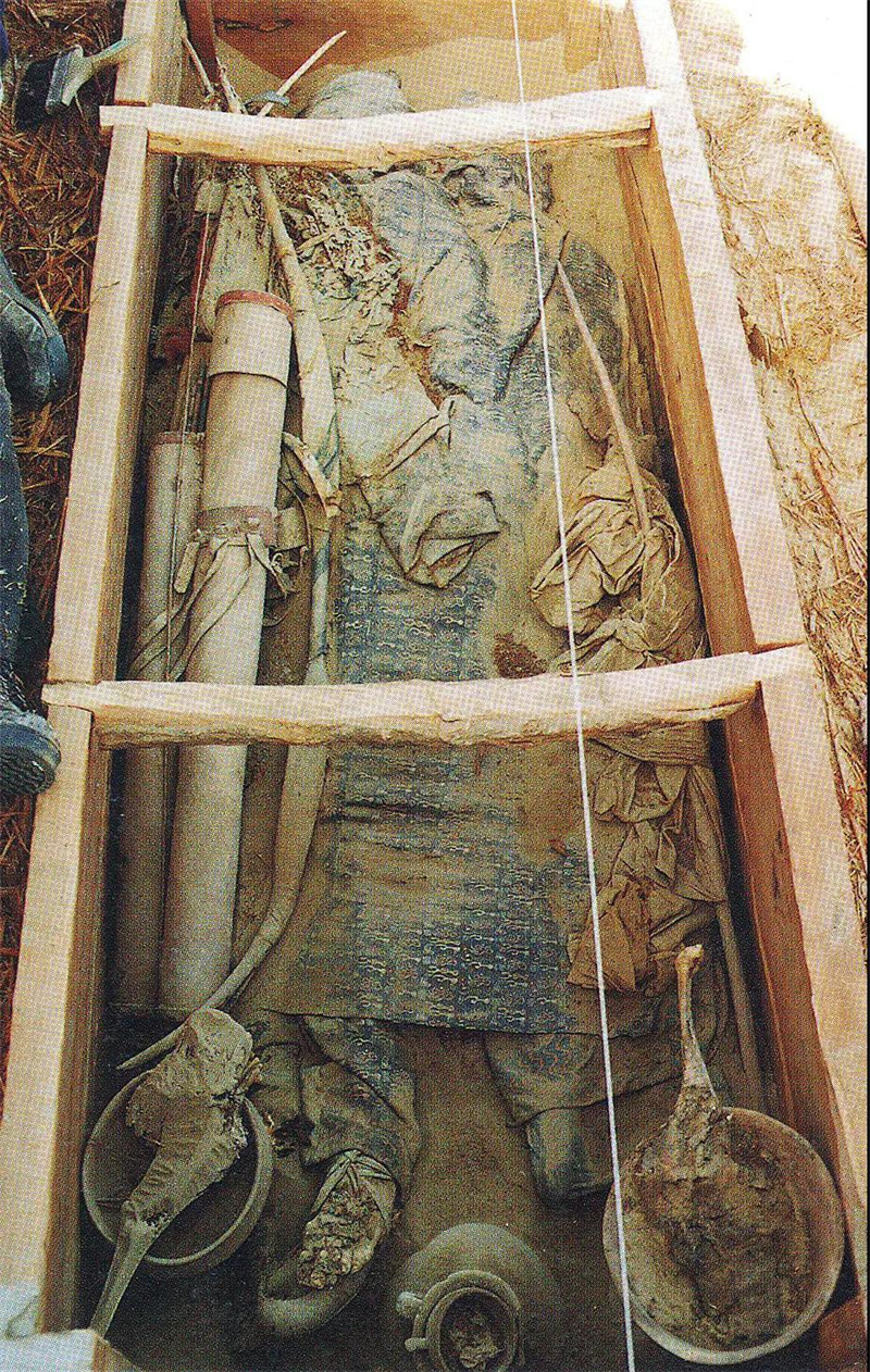 1995年发掘的两座男女合葬墓,随葬品丰厚。墓主人尸体、衣衾保护较好,衣衾面料为汉式五色织锦,高档精美,当是中原皇家作坊的产品。从织锦上“王候合昏千秋万岁宜子孙”、 “五星出东方利中国”非同一般的铭文看,更可能是特制的产品。所以,这两座墓的男性墓主可能为两代精绝王,墓中大量汉锦当为中原王朝的赠赐品。