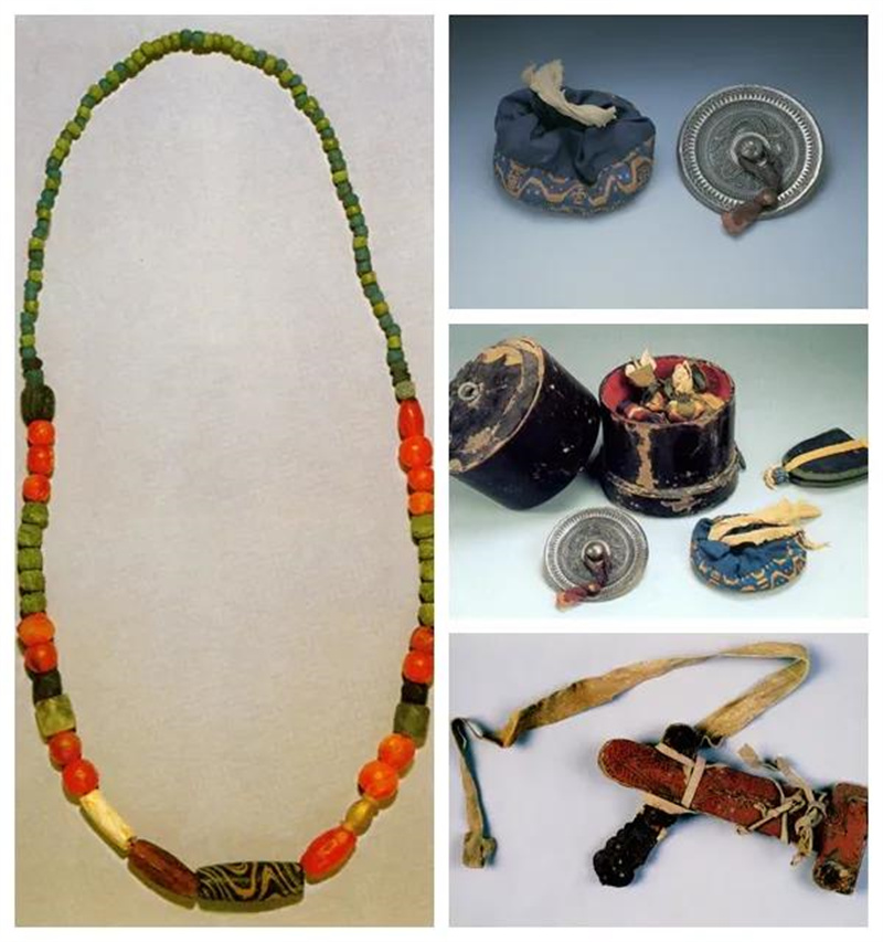 料珠项链(左),龙纹铜镜与镜套(右上);漆奁、栉袋和铜镜(右中),刀鞘(右下)