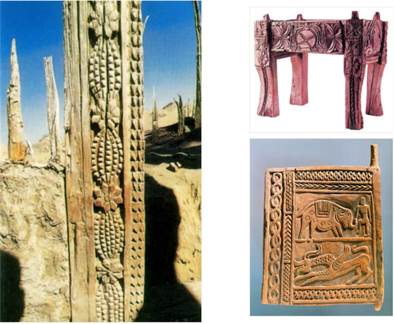 遗址中纹饰精美的雕花门柱(左),遗址出土的雕花木桌(右上),遗址中采集的木雕门板(右下)