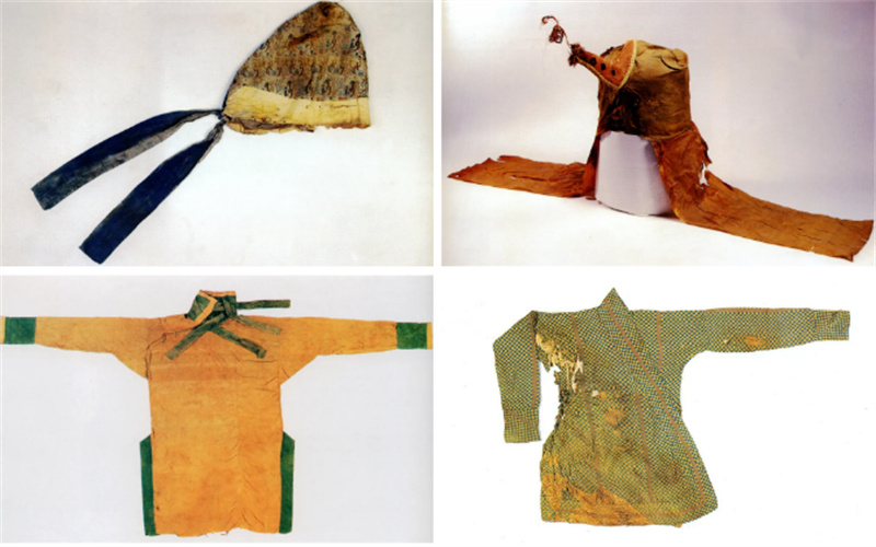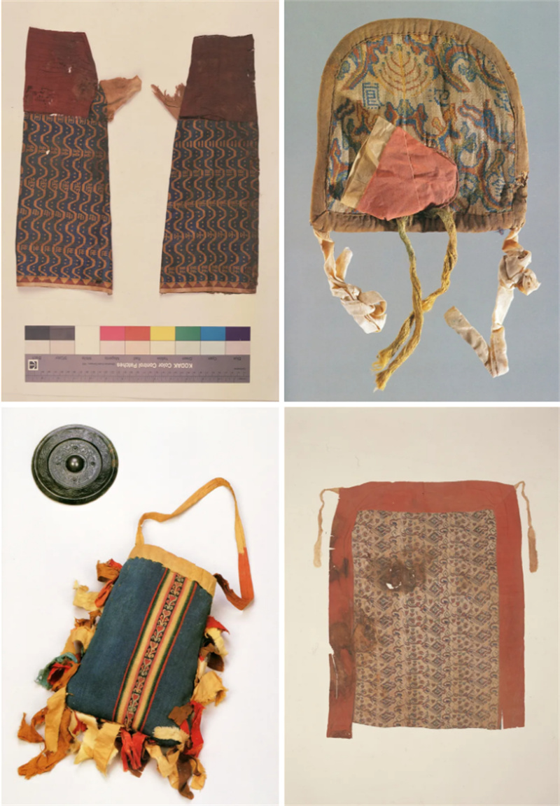 白地云气人物纹锦帽(左上),高领青边黄绢套衫(左下),凤头形绢帽(右上),方格纹锦袍(右下)