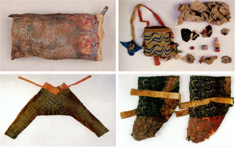 枕头(左上),“长乐大明光”锦裤(左下),锦袋帛鱼(右上),红尼绣花锦靴(右下)