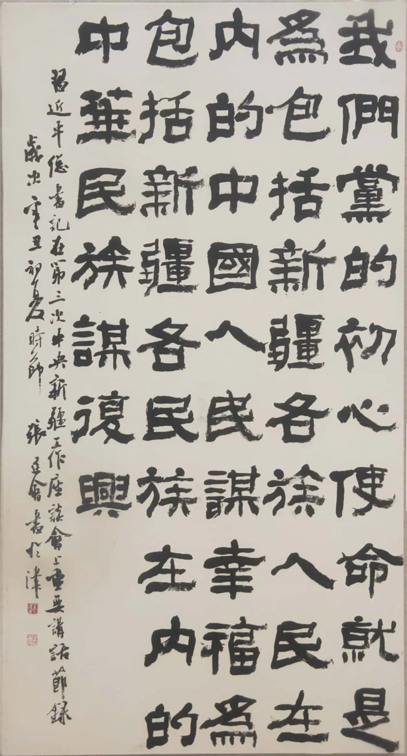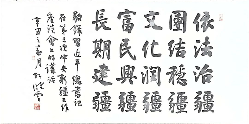 展览主题突出,作品内容以书写习近平总书记关于党的治疆事业和庆祝中国共产党成立100周年的一系列重要讲话为主体,涵盖革命诗词、优秀边疆诗词和援疆干部人才创作的诗文佳句等,具有鲜明政治性,凸显时代感,充满正能量。展览精彩纷呈,各参展单位的书法家和广大援疆干部人才踊跃参与,饱含深情、饱蘸浓墨,把优秀的书法作品呈现给新疆各族人民,体现了广泛的群众性和精湛的艺术性,奏响了铸牢中华民族共同体意识的和谐乐章。