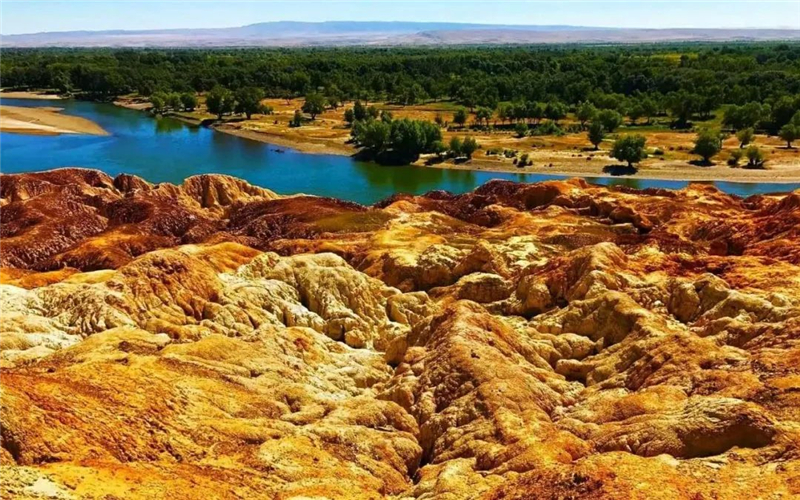 激猛的河流冲击和狂风侵蚀,形成了北岸的悬崖式雅丹地貌,河岸岩层抗风化能力强弱不一,轮廓便会参差不齐,而岩石含有矿物质的不同,又幻化出种种异彩,因此得名“五彩滩”。而南岸却是绿树葳蕤,连绵成林,远处逶迤的山峦与戈壁风光尽收眼底。