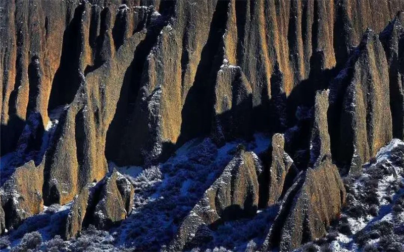 独山子大峡谷从山脚下开始“生长”,向上形成层次分明的土壤层,颜色主要以灰色、黑色为主。