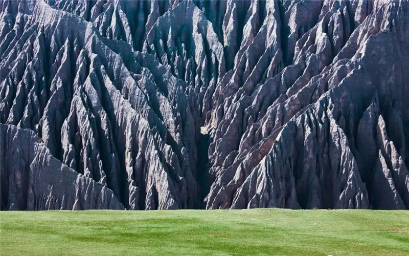 独山子大峡谷从山脚下开始“生长”,向上形成层次分明的土壤层,颜色主要以灰色、黑色为主。为垦荒种地,防止河水泄漏,在谷底修了人工水泥灌渠,但自然河道历经千年,原始风貌依然清晰可见。