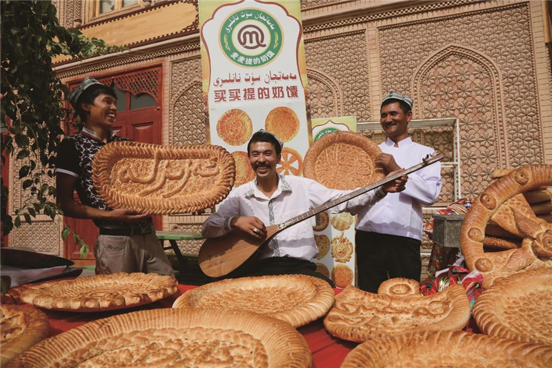 千年古街直通艾提尕尔广场,越往前走,游人越多。他们当中,既有内地来的背包客,又有国际友人,也不乏新疆本地的游客。他们或为自家小女精心选一顶漂亮的花帽,或围坐在路边品尝刚出炉的烤包子,还有的驻足欣赏“沙郎叨克”(一种冰镇饮料)摊主表演的绝活。只见摊主麻利地叉出一碗冰渣,加入酸奶、蜂蜜,前后晃动几次,猛地将碗中的冰渣向空中抛甩,一道一米多高的白色流线出现在空中,引得游客阵阵惊呼,摊主却不慌不忙伸出碗去,将自由落下的冰渣全部稳稳接回。整套动作娴熟无比,博得阵阵喝彩与掌声。来一碗猛啜一口,透彻心骨的凉。这是喀什特有的冷饮,味道甘甜清凉,是人们不可或缺的夏日宠儿。