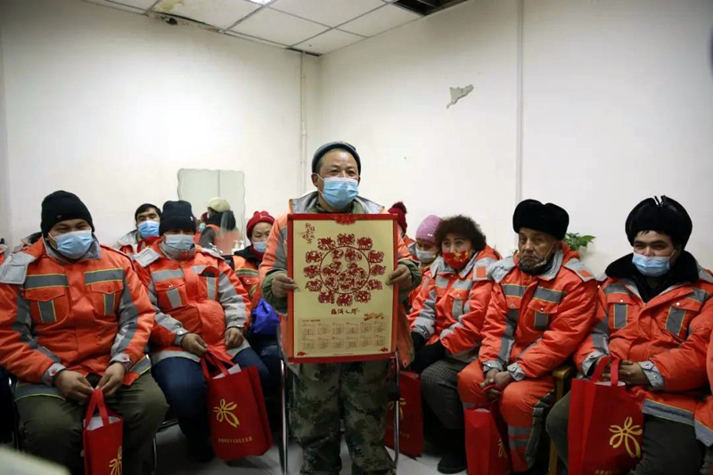 乌鲁木齐市八楼社区环卫驿站的一间小屋中传出清脆欢快的快板声,“新时代新征程,引领群众大步迈……”进入休息间,刚刚结束一段清扫工作的环卫工人整齐地围坐在屋内,几名文艺爱好者身着红裙正在表演反映十九届六中全会精神的快板节目《奋进新时代》、诗朗诵《中华颂》,激情昂扬,感染了在场的每个人。当日,新疆文化馆赴乌鲁木齐市八楼社区环卫驿站、友好南路片区管委会富城国际购物中心为环卫工人、快递小哥、社区居民送上“福袋”与文艺演出。57岁的环卫工人吐尔地·买合木提激动地说:“感谢新疆文化馆送来的精彩演出和新春‘福袋’,虽然天气寒冷、工作辛苦,但我的心里是暖洋洋的。回家后我一定会把春联和福字贴到家门口。”