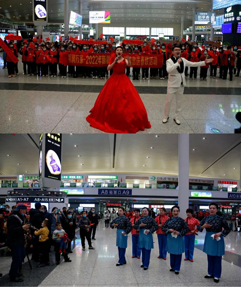2022年春运首日,乌鲁木齐站候车厅内热闹非凡,各级文艺单位齐聚一堂,写春联、送福字,还有安全出行小讲堂,新疆文化馆组织的送演出送春联送福字活动显得格外引人注目。“伟大的中国共产党,风华正茂,山高水长,昂首挺立在新时代的征程上”,当文化志愿者唱响歌曲《领航》时,引得旅客驻足欣赏。寒假返乡的学生举起春联和福字,随着歌声摇摆双臂,参与到表演中,构成最靓丽的风景线。随后的京剧联唱更是令人耳目一新,许多小朋友好奇的站成一排观赏表演,一旁的家长也饶有兴致地讲起京剧的基本常识,形成良好互动。