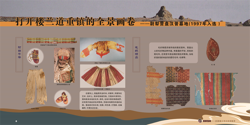 在服饰上,营盘居民追时尚、求新样,其服饰在艺术、技术上,既体现地域风格,又吸纳中原特色。面料既有本地的毛布、棉布,也有中原的锦绣绫罗,还有受内地丝织技术影响,西域本地模仿织造的丝绸;服装款式有长袍、短襦、间色裙、灯笼裤、绞编履等,可谓多姿多彩。