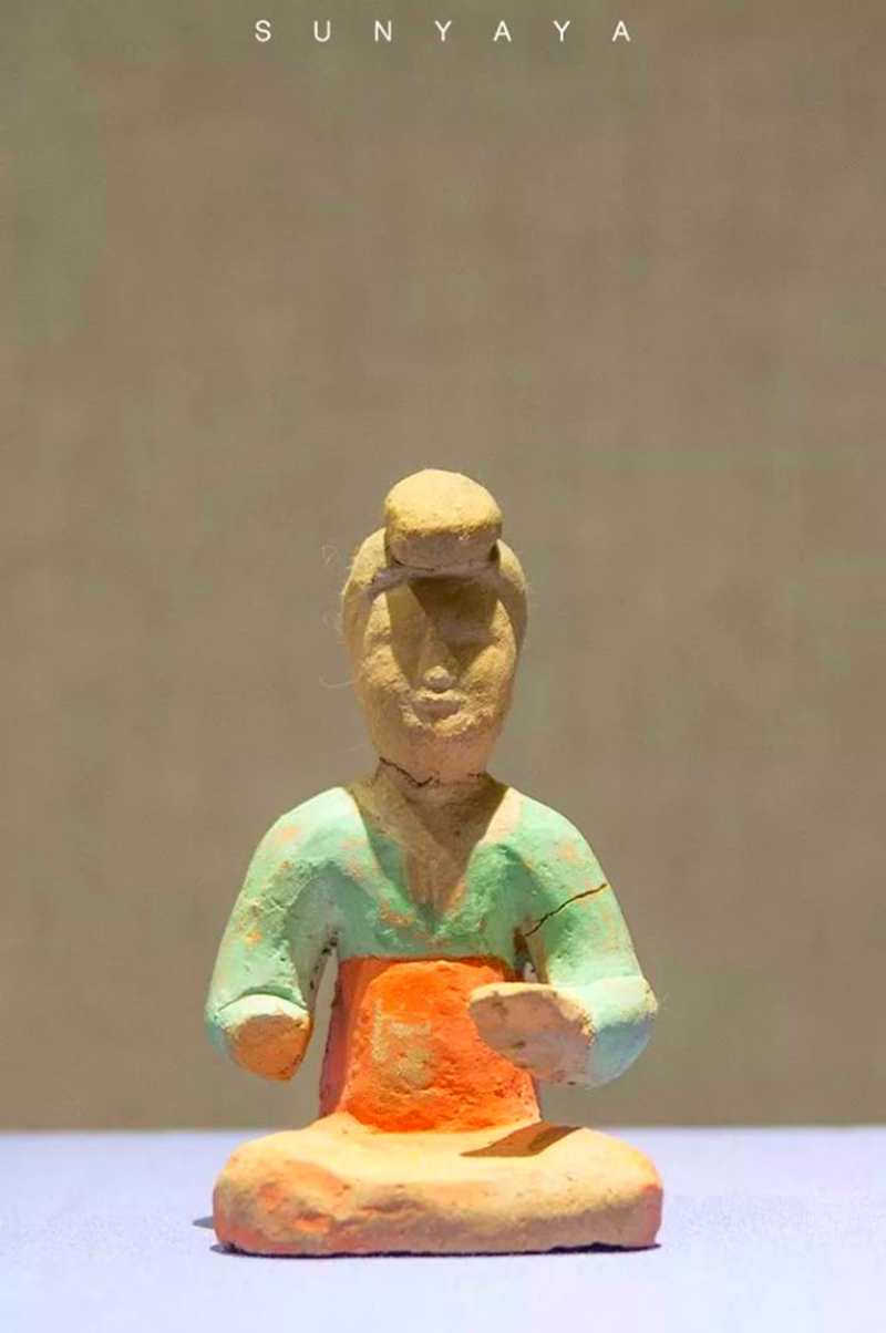 彩泥塑坐姿弹琴女俑,吐鲁番阿斯塔纳墓地出土。图片来源:微博@羊扬杨