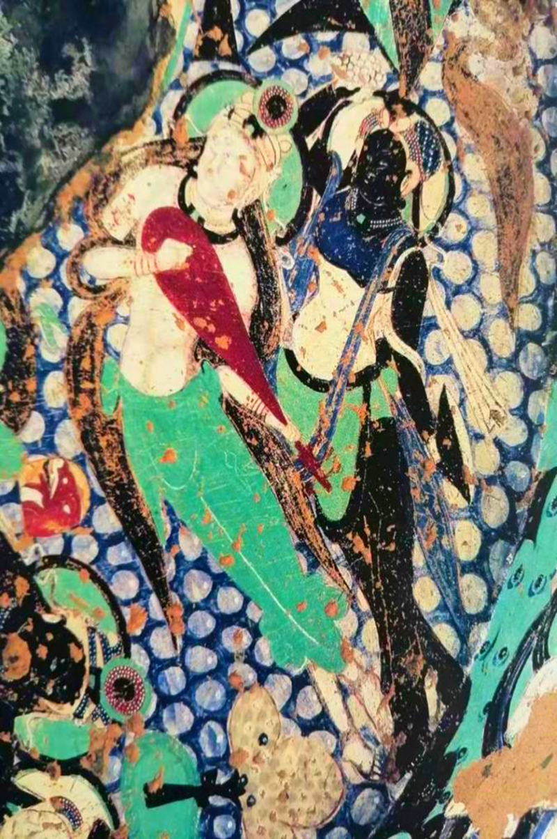5号飞天达人姐姐们一身穿蓝色,呈现出细腰、丰满的女性形象,作托盘散花状;石窟壁画中的散花场景多以帝释窟禅定和佛涅槃故事中的“飞天散花”形象出现,颇具一番神话色彩。