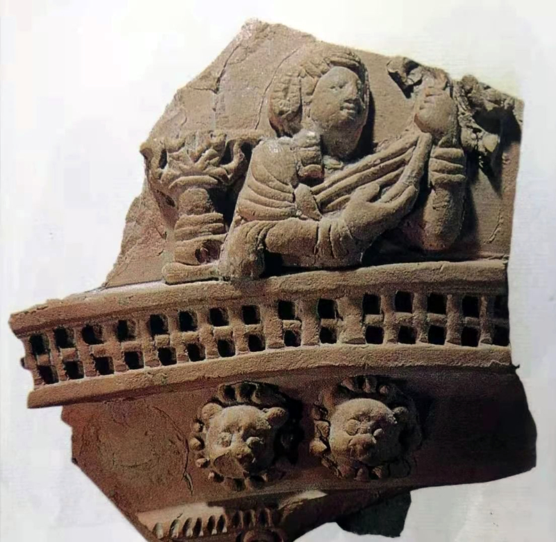 唐代弹琵琶者陶片,出土于和田县巴拉玛斯遗址。