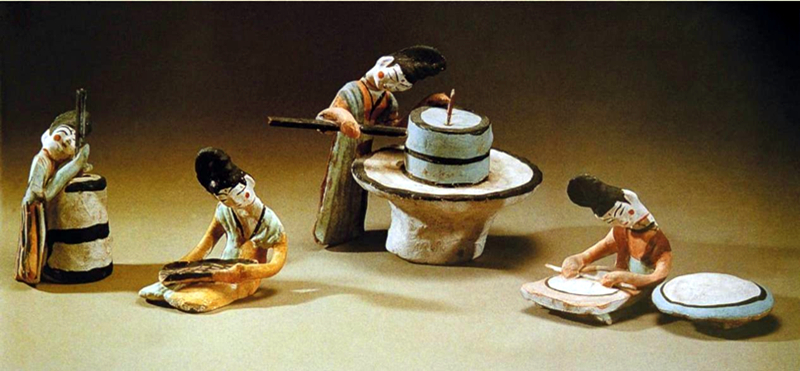 四尊劳动妇女俑的姿势、神态各异。她们手持劳动工具,进行着不同工序的劳动,展现了唐代吐鲁番妇女舂粮、簸粮、推磨、擀面、烙饼的全过程。