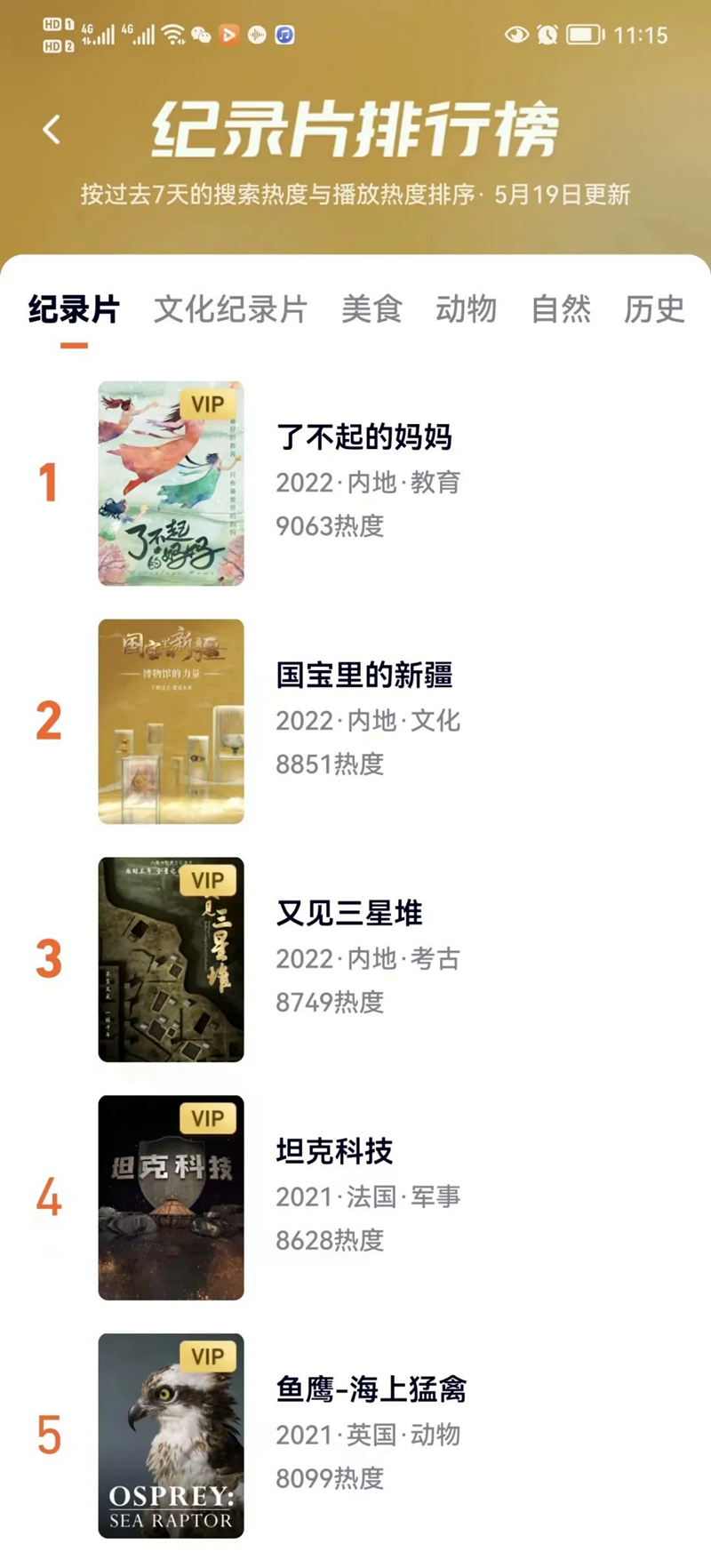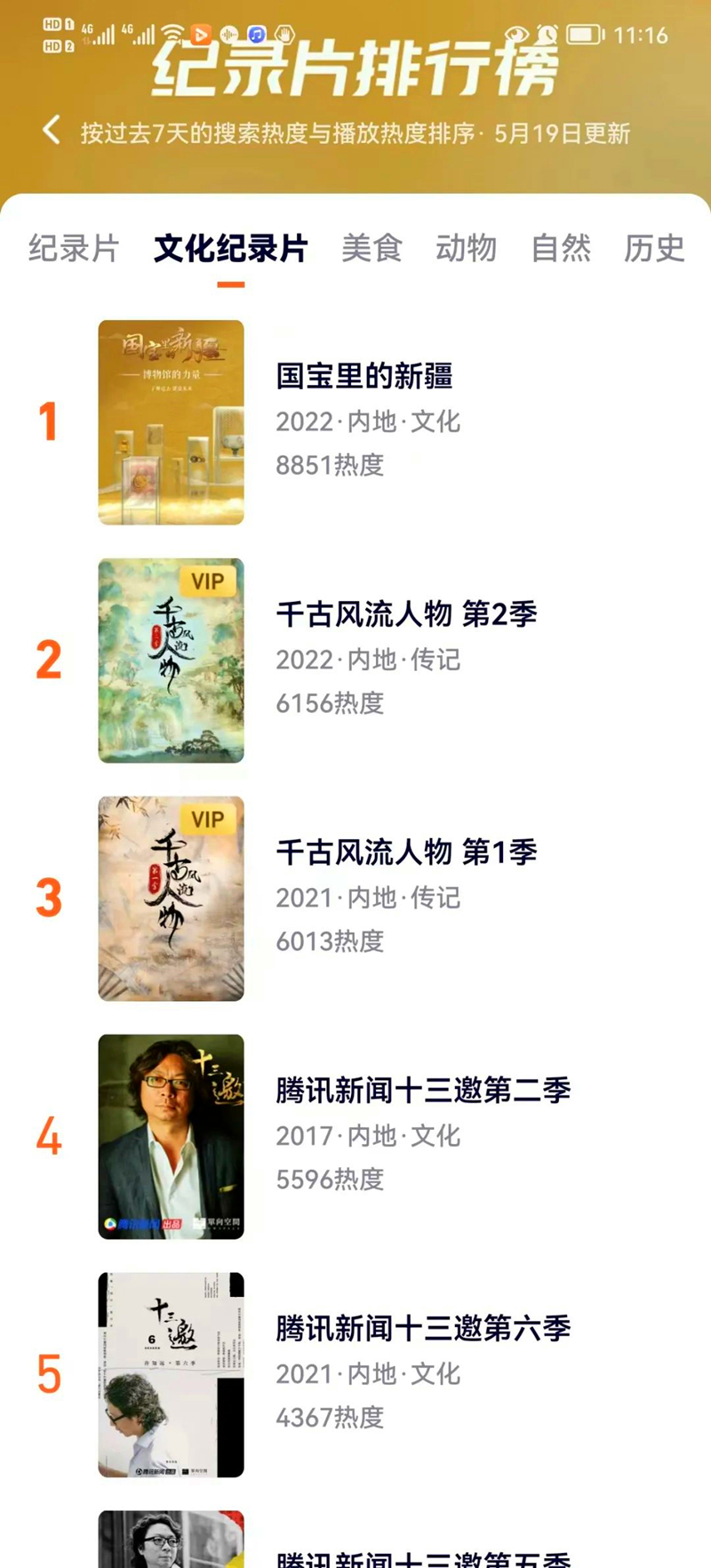 5月16日上线腾讯视频后,连续两周占据文化类纪录片第一名,全领域排名第二名。