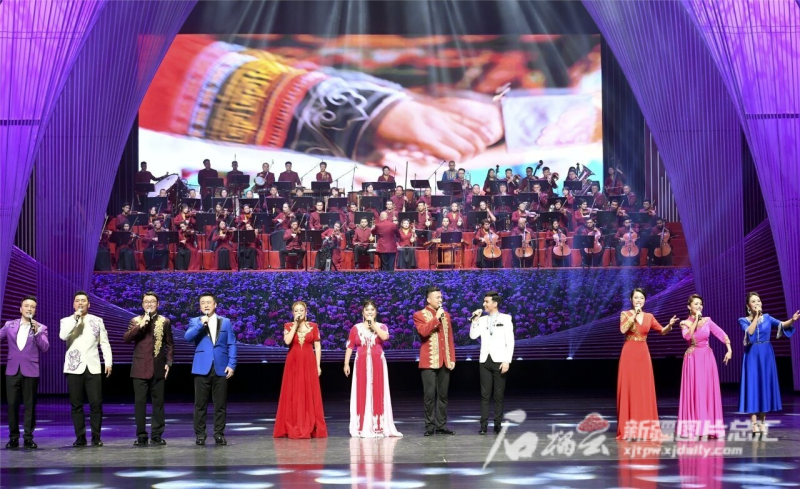 乐队的高台上,一声苍茫厚重的清唱开启了十二木卡姆选段《朱拉》的表演,歌声来自新疆艺术剧院木卡姆艺术团歌唱家买买提·吐尔逊。紧接着在管弦乐器和民族乐器合奏的乐曲中,19位姿容靓丽、舞姿端庄的姑娘盛装登场,展现着新时代新疆女性的美丽和自信。