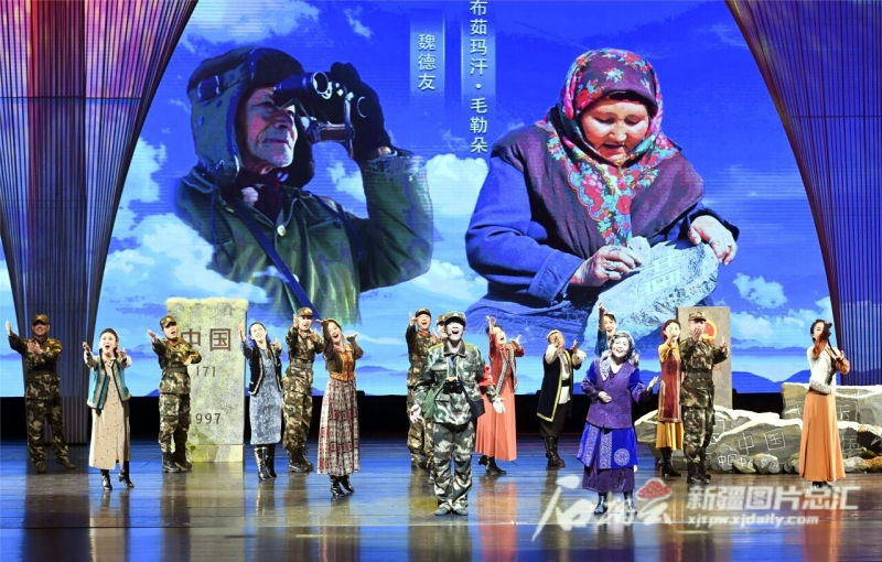 无惧寒风暴雪,布茹玛汗·毛勒朵脚步蹒跚走到她摆放的“中国石”旁;中哈边境界碑前,魏德友目光如炬向边境线眺望……音乐短剧《护边员》结合话剧与歌剧的表达手法,在同一个舞台上营造两个不同的故事空间,向奋战在边防一线的护边英雄致敬。
