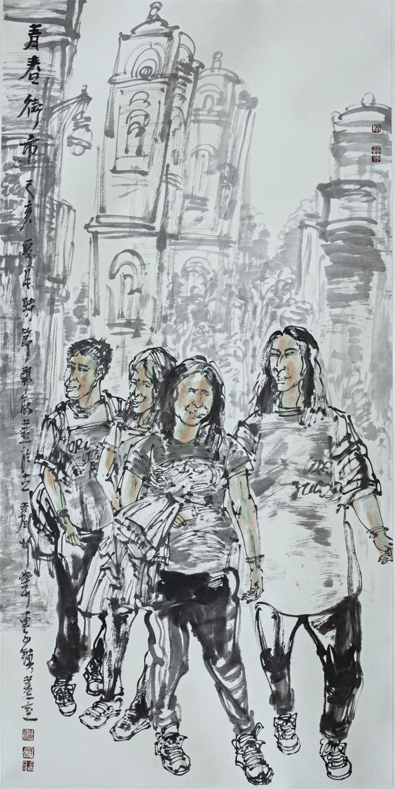 李开能 《青春街市》中国画 136cm×68cm