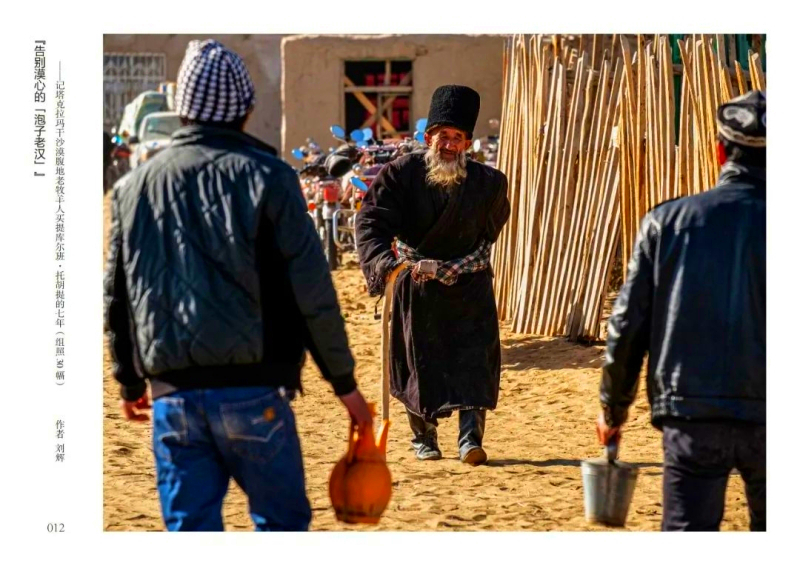 《告别漠心的“泡子老汉”》作品共30幅,记录了生活在塔克拉玛干沙漠腹地的一名老牧羊人买提库尔班·托胡提7年生活变迁。摄影家刘辉自2012年7月开始拍摄和田地区于田县达里雅布依乡的画面,获得了完整翔实的记录影像15万余幅,撰写记录100余万字。“在达里雅布依乡,提起‘泡子老汉’买提库尔班·托胡提,老少皆知,这组照片记录老人7年的生活经历,讲述了他和村民走出大漠腹地、搬迁到新居的心路历程。”刘辉说。