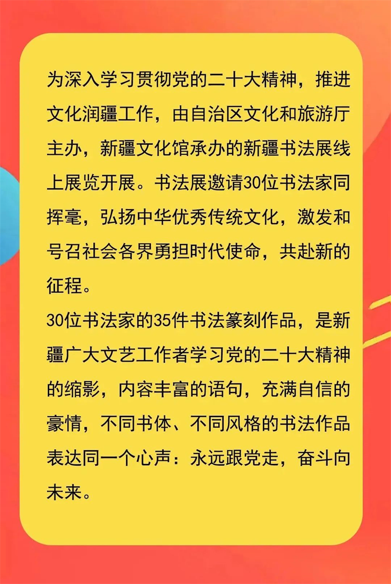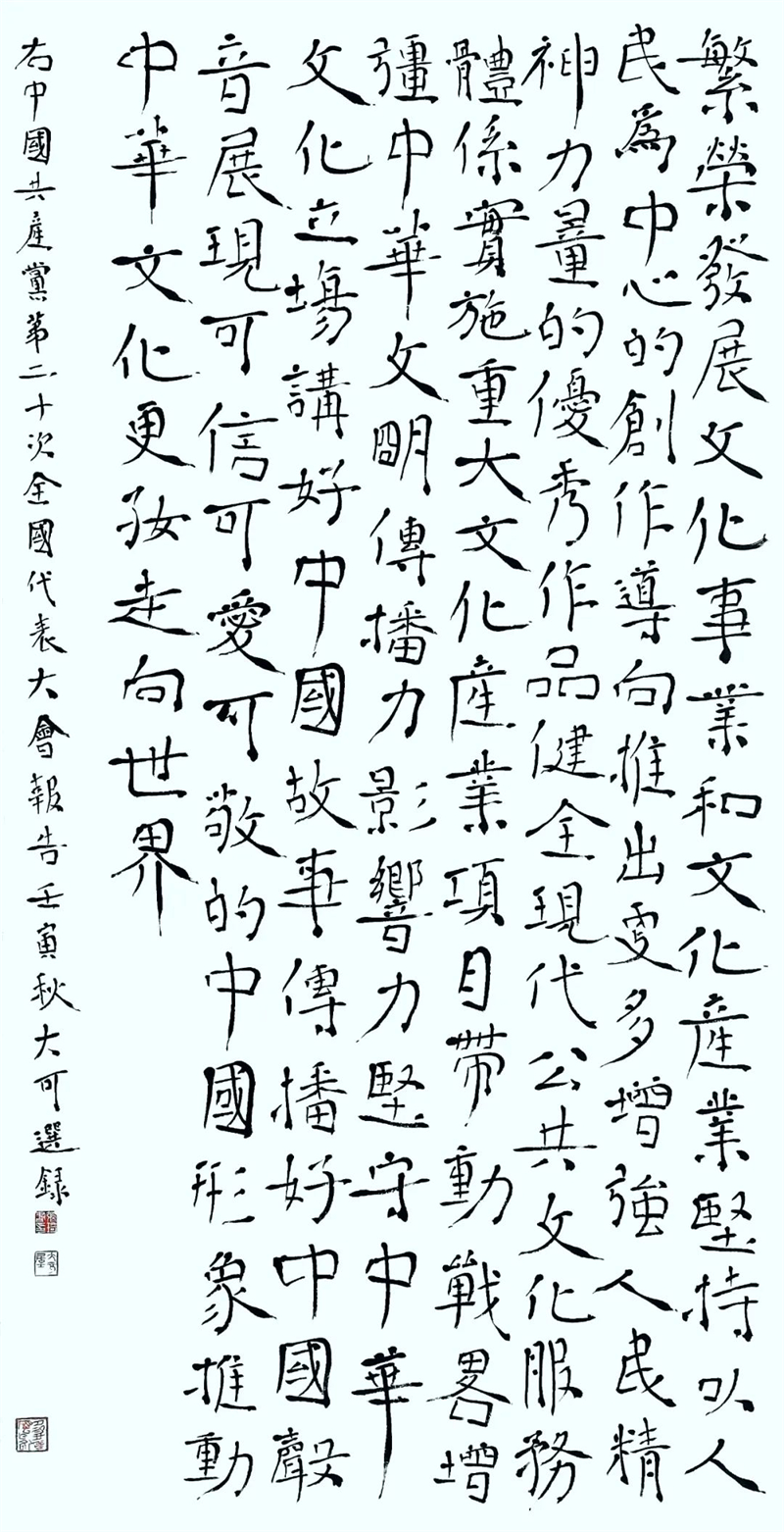 书法:繁荣发展文化事业和文化产业,坚持以人民为中心的创作导向,推出更多增强人民精神力量的优秀作品,健全现代公共文化服务体系,实施重大文化产业项目带动战略。增强中华文明传播力影响力,坚守中华文化立场,讲好中国故事、传播好中国声音,展现可信、可爱、可敬的中国形象,推动中华文化更好走向世界。