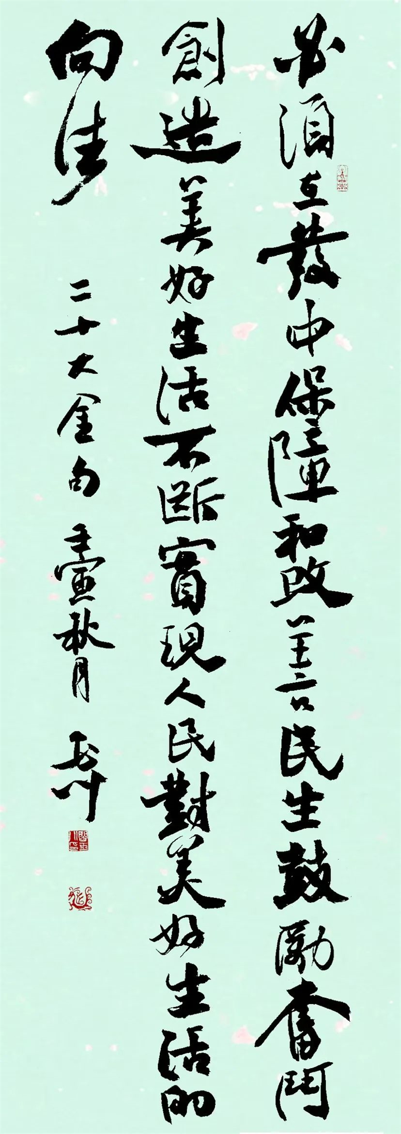 作品释文:经过不懈努力,党找到了自我革命这一跳出治乱兴衰历史周期率的第二个答案,确保党永远不变质、不变色、不变味。
