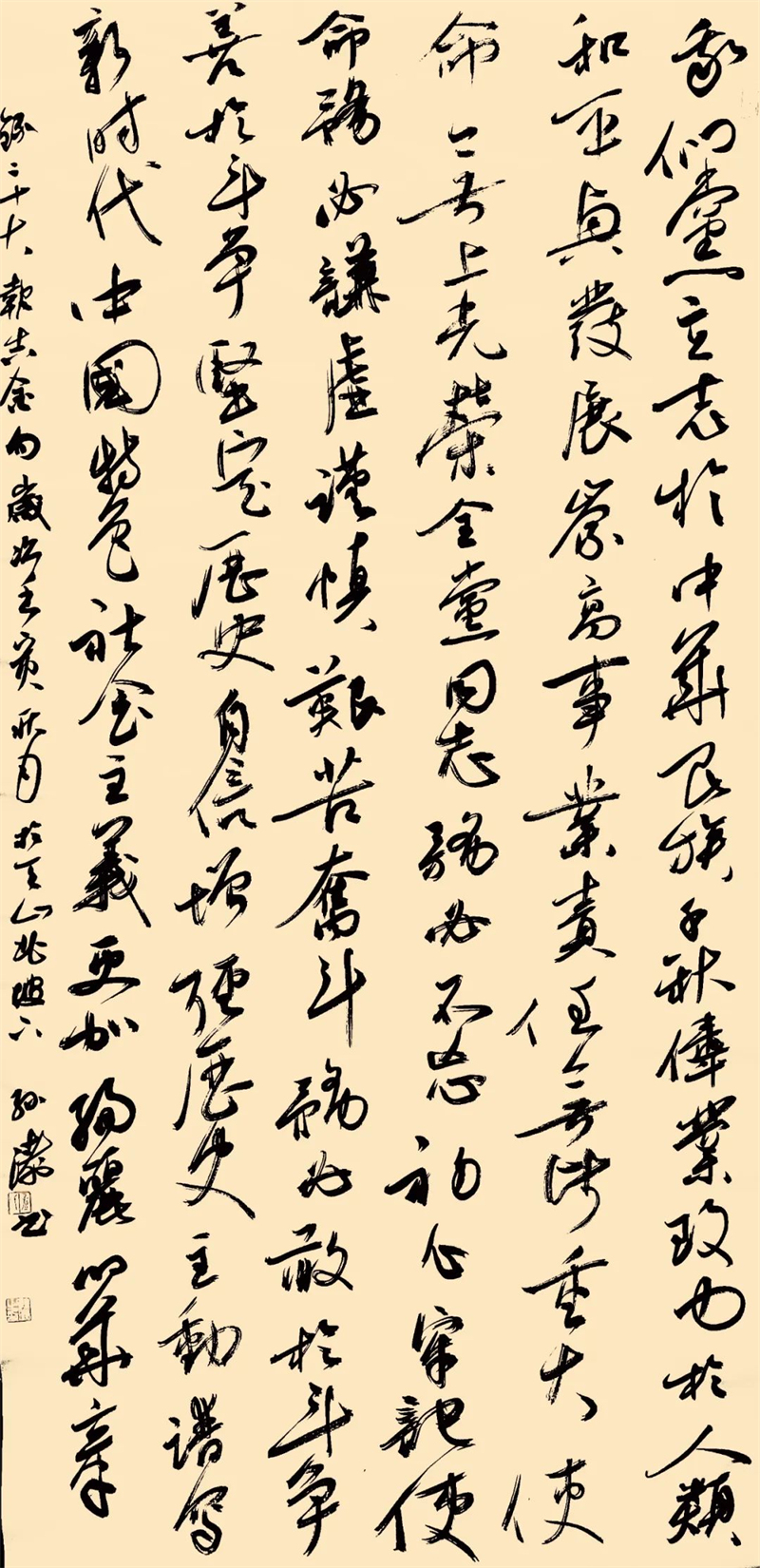 作品释文:我们要坚持教育优先发展、科技自立自强、人才引领驱动,加快建设教育强国、科技强国、人才强国,坚持为党育人、为国育才,全面提高人才自主培养质量,着力造就拔尖创新人才,聚天下英才而用之。