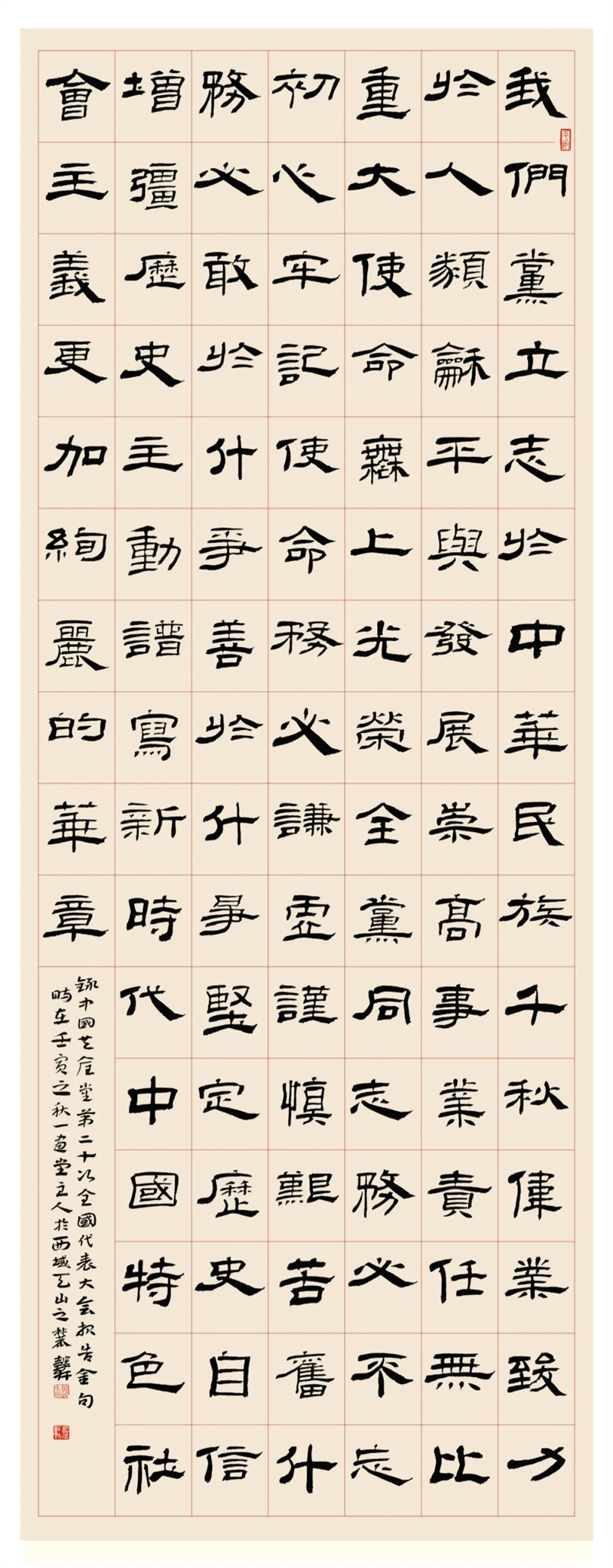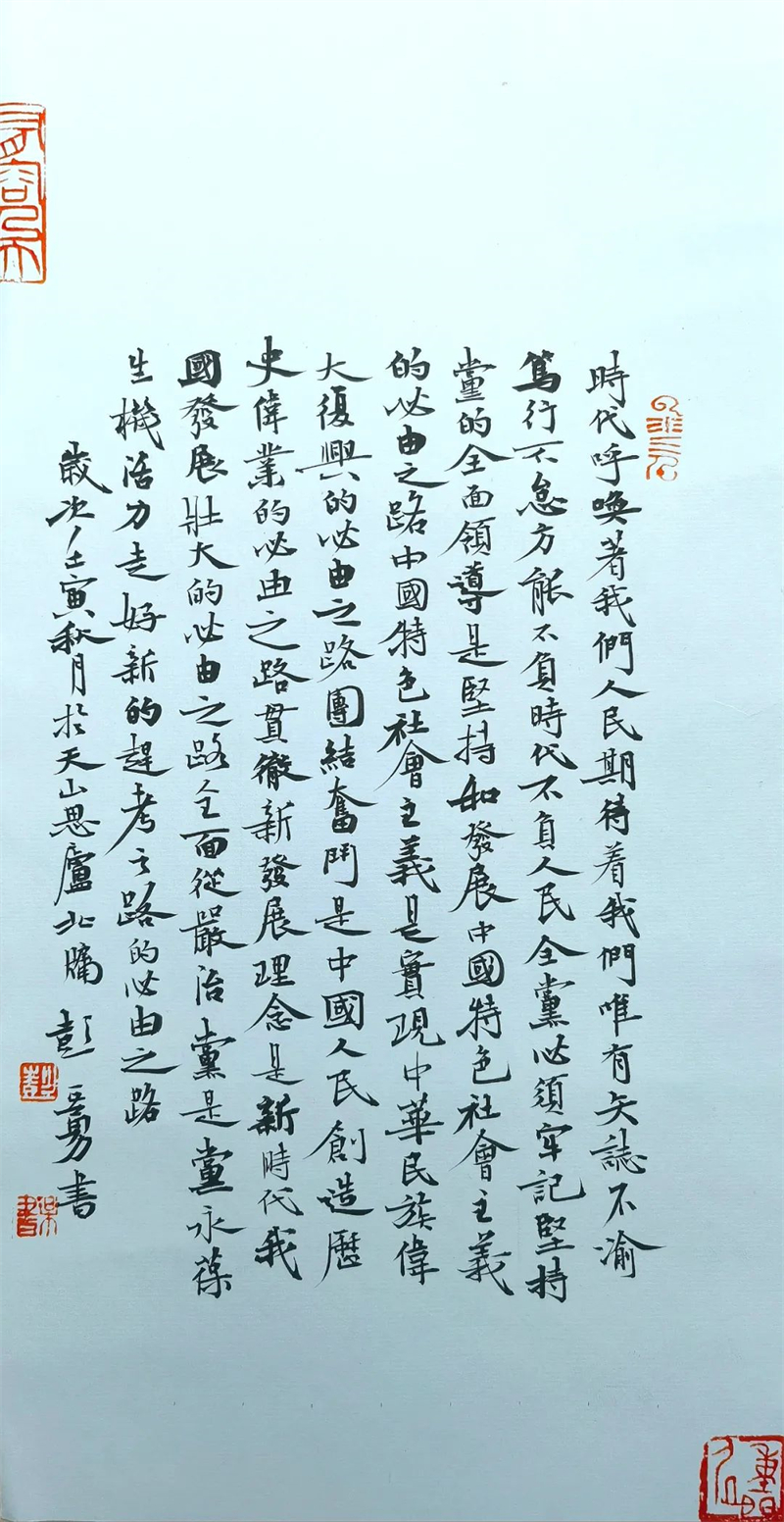 作品释文:时代呼唤着我们,人民期待着我们,唯有矢志不渝,笃行不怠,方能不负时代,不负人民。全党必须牢记,坚持党的全面领导是坚持和发展中国特色社会主义的必由之路,中国特色社会主义是实现中华民族伟大复兴的必由之路,团结奋斗是中国人民创造历史伟业的必由之路,贯彻新发展理念是新时代我国发展壮大的必由之路,全面从严治党是党永葆生机活力,走好新的赶考之路的必由之路。