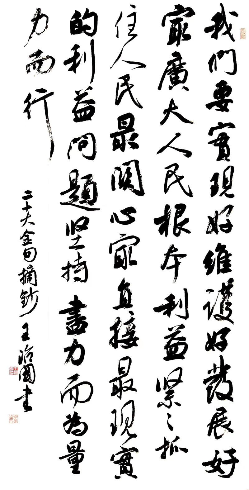 作品释文:我们要实现好、维护好、发展好最广大人民根本利益,紧紧抓住人民最关心最直接最现实的利益问题,坚持尽力而为、量力而行。