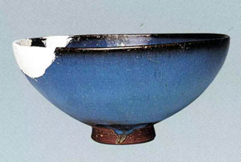 天青色钧瓷碗除足部外,碗内外施天青色釉,青中泛兰,釉面光洁透亮,器型周正,钧瓷的釉色感觉具有灵动性。