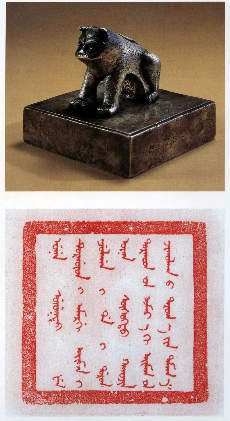 土尔扈特银印,长10.7厘、宽10.7厘、通高7.6厘米,重4.4千克。虎钮,正方形印座,印面镌刻满蒙两种文字,意为“忠诚的旧土尔扈特部英勇之王”。这是清乾隆帝颁发给土尔扈特首领渥巴锡的官印,也是清政府对东归的土尔扈特蒙古诸部首领封爵赐印的历史物证。