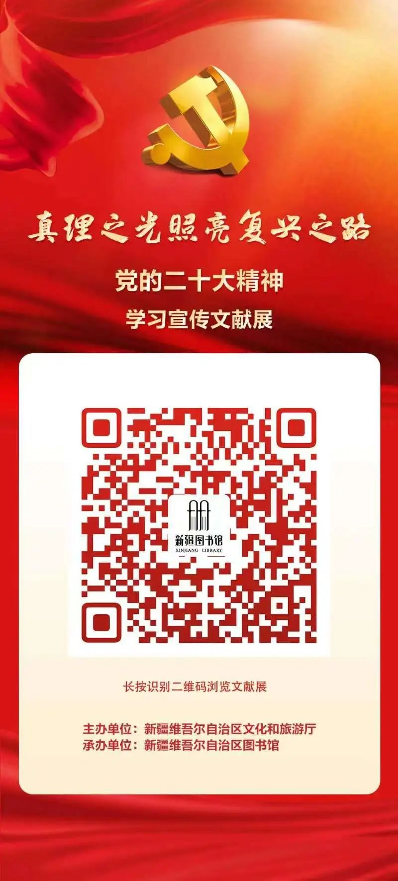 为深入贯彻落实自治区党委关于学习贯彻党的二十大精神的部署安排,推动党的二十大精神在天山南北全面落地生根,新疆图书馆梳理馆藏文献资源,策划推出“真理之光照亮复兴之路——党的二十大精神学习宣传文献展”,展览结合党的二十大报告,配套精选馆藏文献,嵌入数字阅读二维码,为更好服务各族干部群众深入学习、广泛宣传党的二十大精神提供直观便捷且内容厚重的新载体。