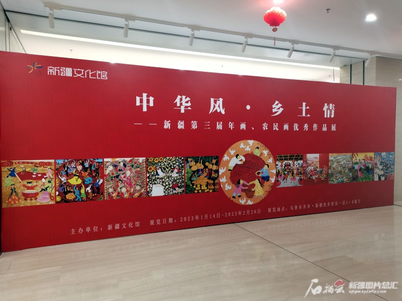 “中华风·乡土情——新疆第三届年画、农民画优秀作品展”宣传展板。石榴云/新疆日报记者 李莉摄