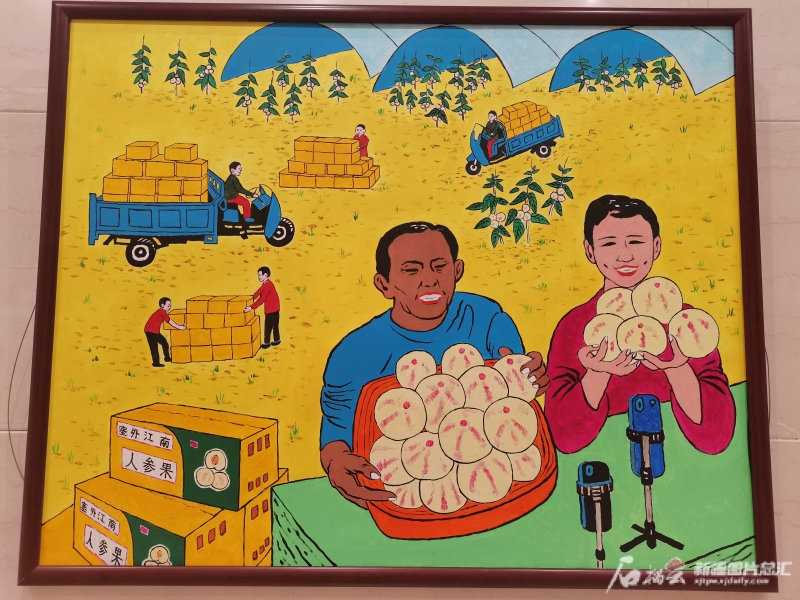 此次展览中,西尔艾力·艾买提创作的《丰收秋景》、李杰创作的《瓜果满园》、王军创作的《秋拾》、米娜瓦尔·木台力甫创作的《文化大院》4幅作品,入选了由中宣部、中央文明办、文旅部、中国美术家协会、中国民间文艺家协会主办的“新生活·新风尚·新年画”——我们的小康生活主题美术创作征集展示活动。