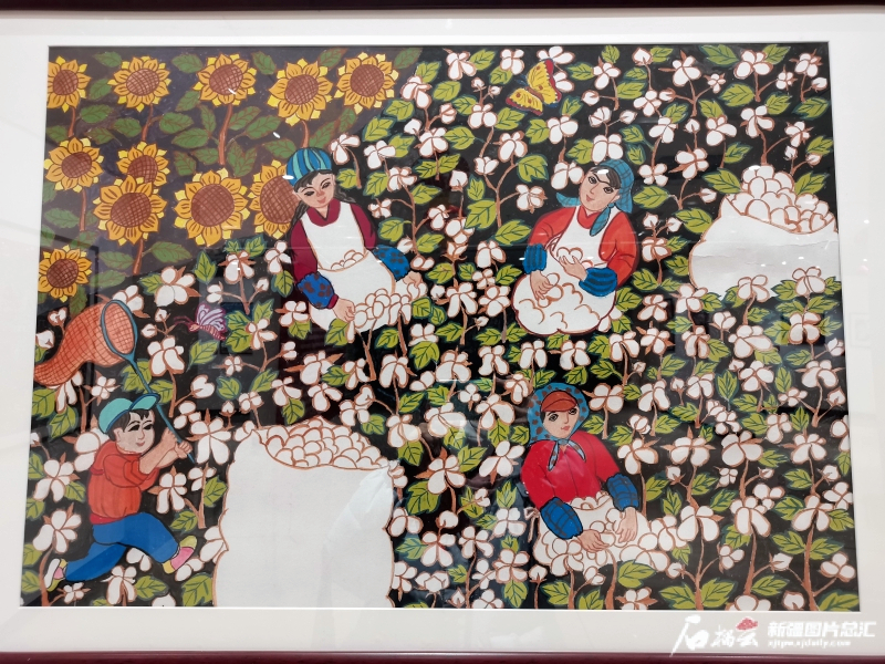 “中华风·乡土情——新疆第三届年画、农民画优秀作品展”上的农民画《秋拾》。石榴云/新疆日报记者 李莉摄