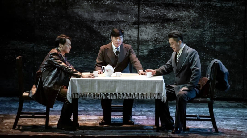 本次服装设计结构,以暖棕色系配合黑白冷灰为主调间接大屏,以红色为高点,从服装角度出发简化色彩斑斓度摒弃繁华,以色块分割场次内容,运用色彩的高低饱和深浅不一营造奇妙的故事气氛表达年代特色,描绘了革命先烈视死如归的时代厚重感。