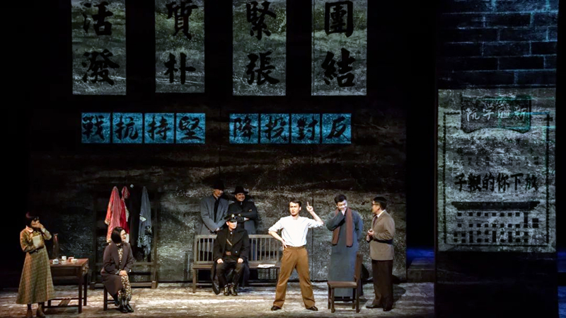 话剧《林基路》舞台美术运用电动条屏和机械平台组合运动的方式形成变化。前、中、后三组各四片条屏,通过打开、收缩、分裂、组合,形成大小不同、形状各异的舞台结构。再通过条屏表面正投视频与天幕LED大屏幕视频相结合,呈现出或开阔、或闭塞、或疏朗、或压抑的戏剧空间。机械平台横向运动,方便在戏剧过程中“无缝衔接”运输布景和道具,使得场景转换更加流畅。这种舞台样式的特点是灵活多变、可虚可实,特别方便心理空间和多时空的展开,非常符合剧作——心理现实主义的戏剧风格。