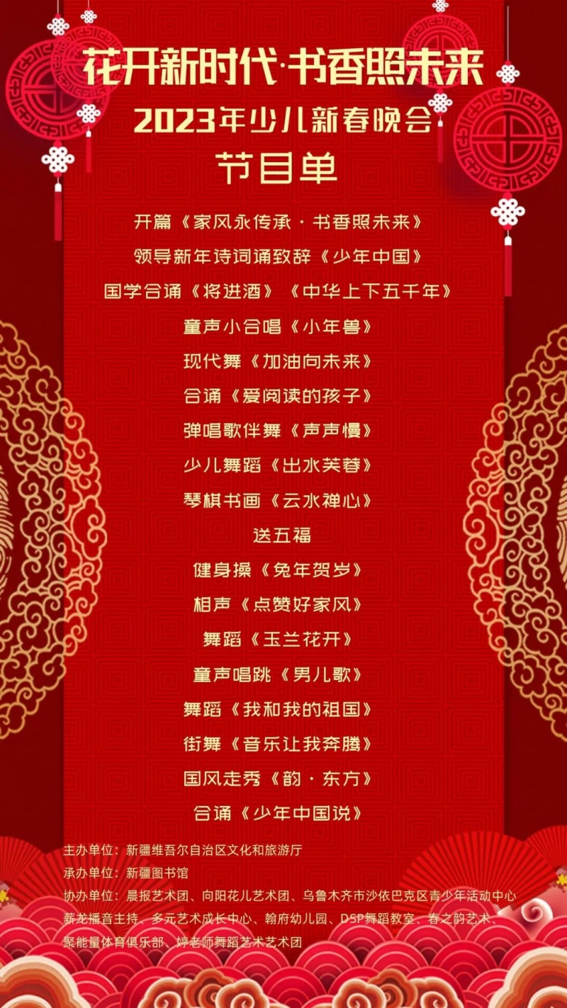 “花开新时代 书香照未来”2023年少儿新春晚会节目单。新疆图书馆供图