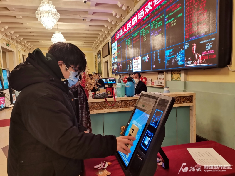 26日晚,观众在新疆人民剧场刷码检票,观看高清影像版《哈姆雷特》。石榴云/新疆日报记者李莉摄