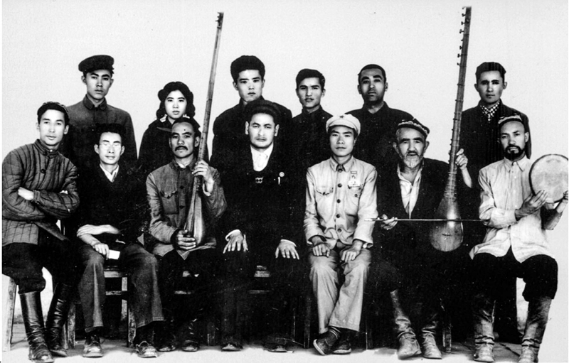 上世纪50年代,万桐书(前排左二)、吐尔迪·阿洪(前排右二)等十二木卡姆整理工作组成员合影。(资料片)