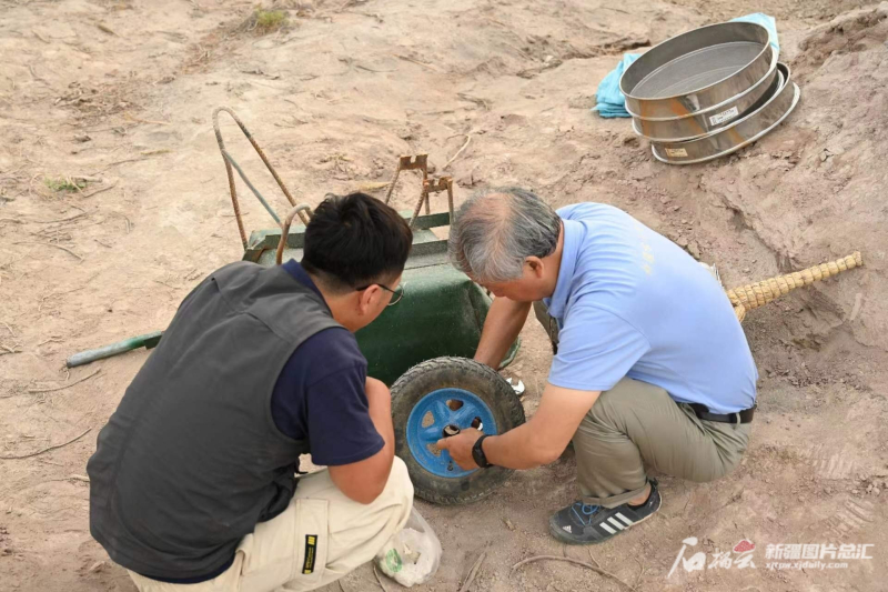 水涛教授(右)和学生在阿克塔拉遗址群考古现场“修车”。 图片由水涛教授提供