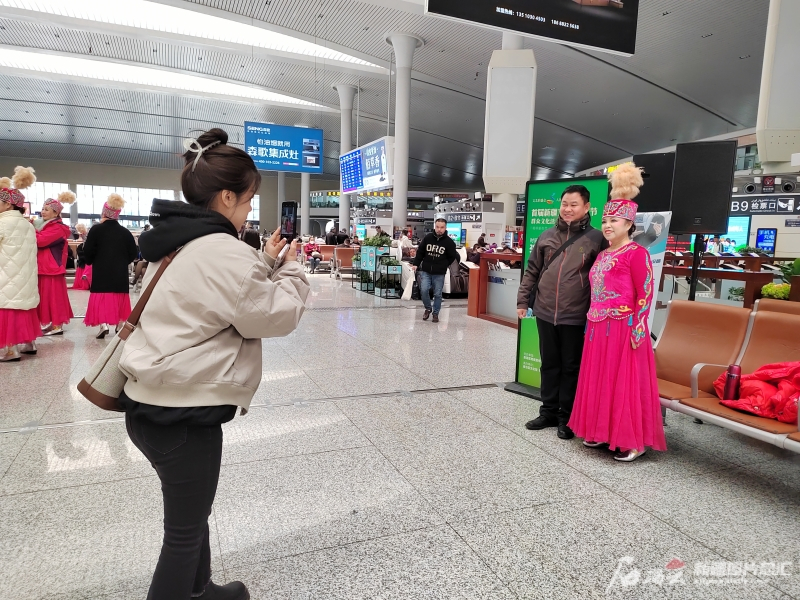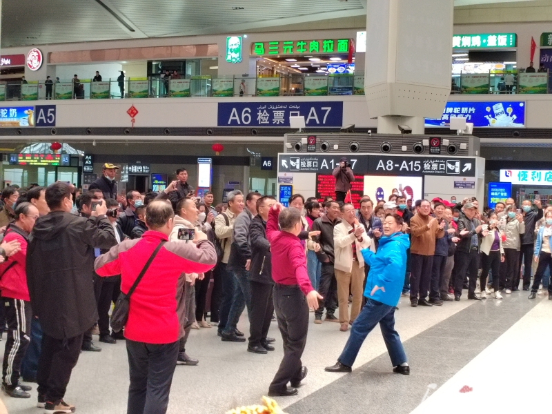 11时许,伴随着《掀起你的盖头来》的乐曲声响起,坐在候车大厅中央咨询台附近的一群“旅客”突然起身,他们相互挥手,合唱起这首熟悉的歌曲,一时间吸引了不少旅客围观。