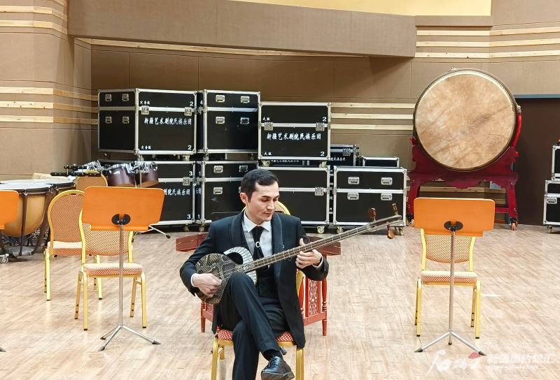 来自喀什地区歌舞团的阿卜力孜·艾尔肯用热瓦普弹奏乐曲《花园》。石榴云/新疆日报记者王新红摄