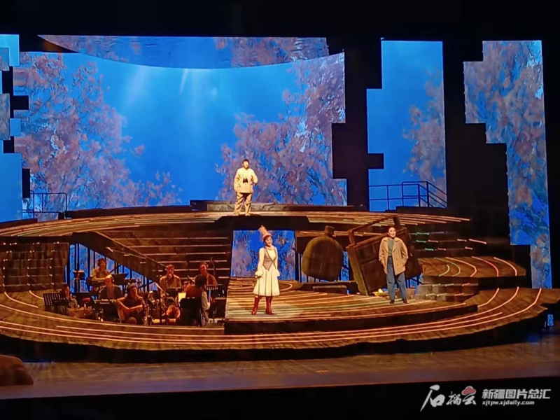 “我们把现场流行乐队呈现在舞台上,对于整场演出来说,也是一个很大的挑战。”新疆艺术剧院歌剧团创研室作曲家木扎帕尔·阿布来提介绍,音乐剧既使用了冬不拉、斯布孜额等传统民族乐器,也使用了电吉他、贝斯等现代电声乐器。将乐队置于舞台之上,形式新颖,现代音乐与民族艺术交织融合,吸引了不少年轻人的关注。