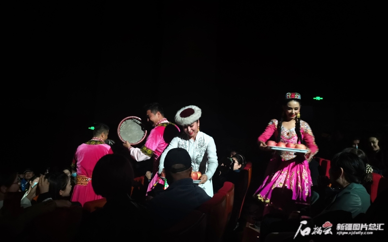 动感的鼓点声中,演员来到观众席中,男演员快乐地敲击手鼓,女演员手拿托盘,将又大又红的阿克苏苹果送给观众。