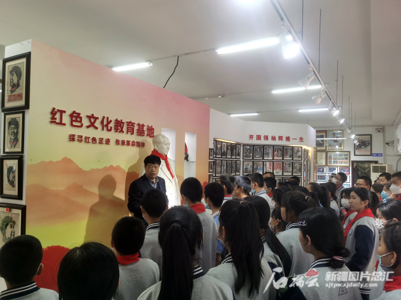 克拉玛依市红色记忆展览馆创办人陈健在该馆为当地中学生讲解红色文化故事。陈健供图