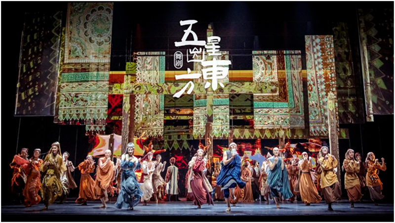 舞剧《五星出东方》以考古现场发掘出汉代文物“五星出东方利中国”锦护臂为引,叩开时空隧道,由此讲述了汉朝戍边将领奉在精绝古城与北人首领之子建特、精绝首领之女春君之间,从剑拔弩张到并肩携手、从素不相识到深深认同,结下深厚情谊的动人故事。